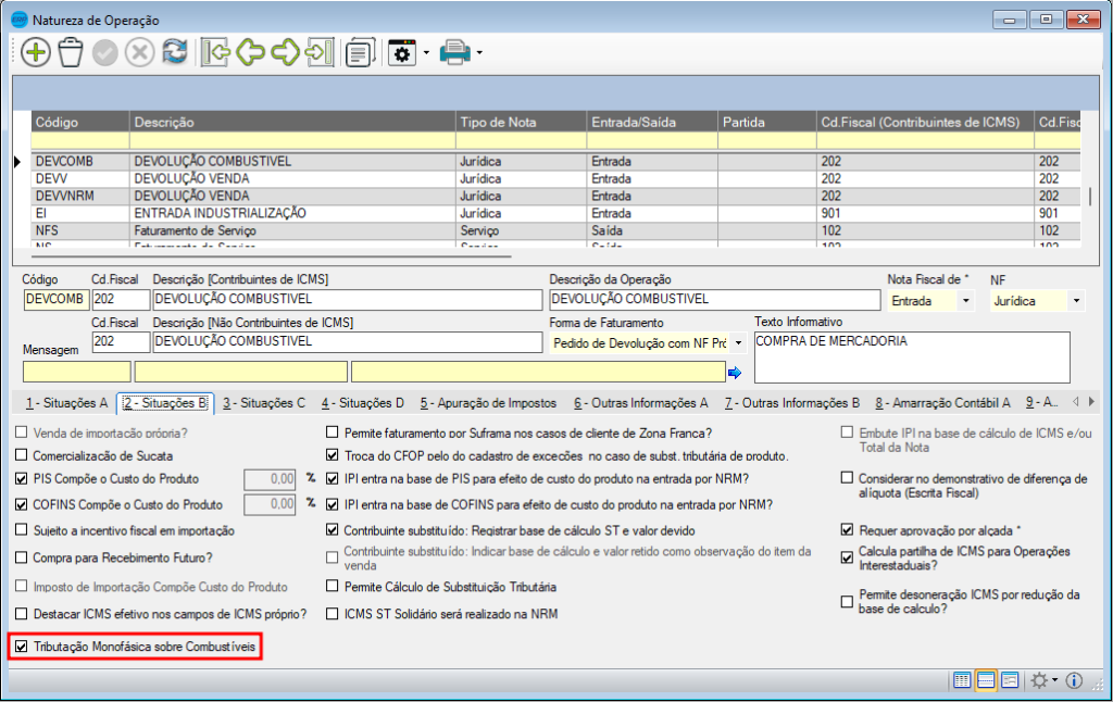 Ao ativar a opção de tributação monofásica na Natureza de Operação, o sistema processará os valores conforme o CST utilizado: