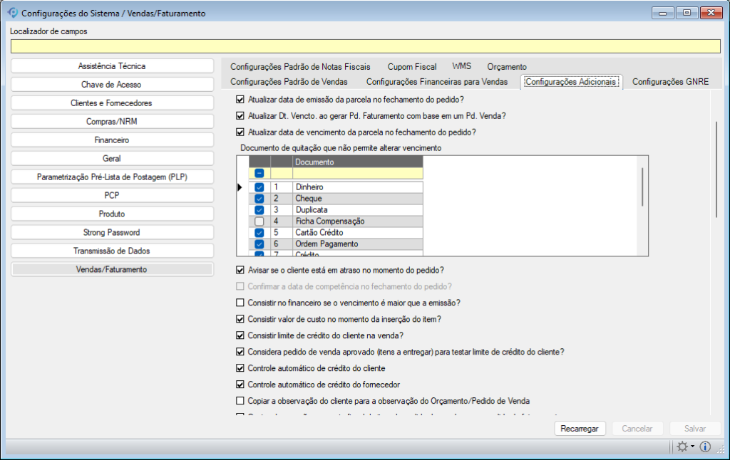 - Regra: Documentos inseridos neste grid não terão suas datas de vencimento alteradas ao transformar o pedido em faturamento, mesmo que a configuração global de atualização esteja ativa.