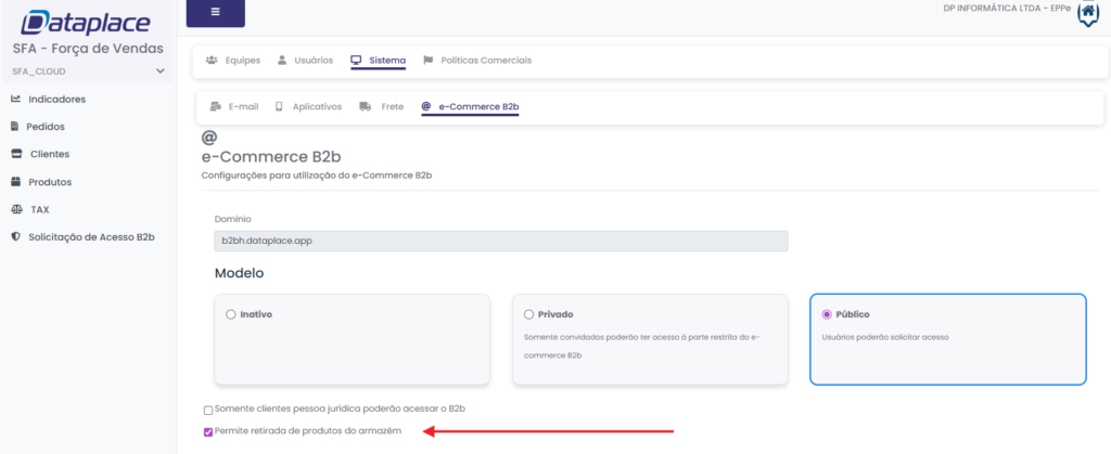Quando ativada, a opção de retirada passa a ser exibida no checkout do B2B.