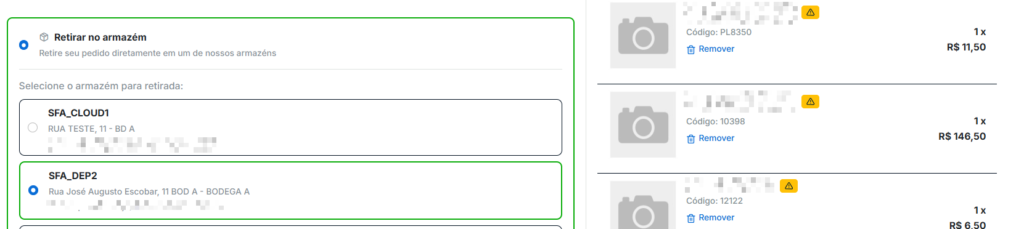 - Será exibida a opção, “Retirar no armazém”, possibilitando escolher um armazém listado para retirada.