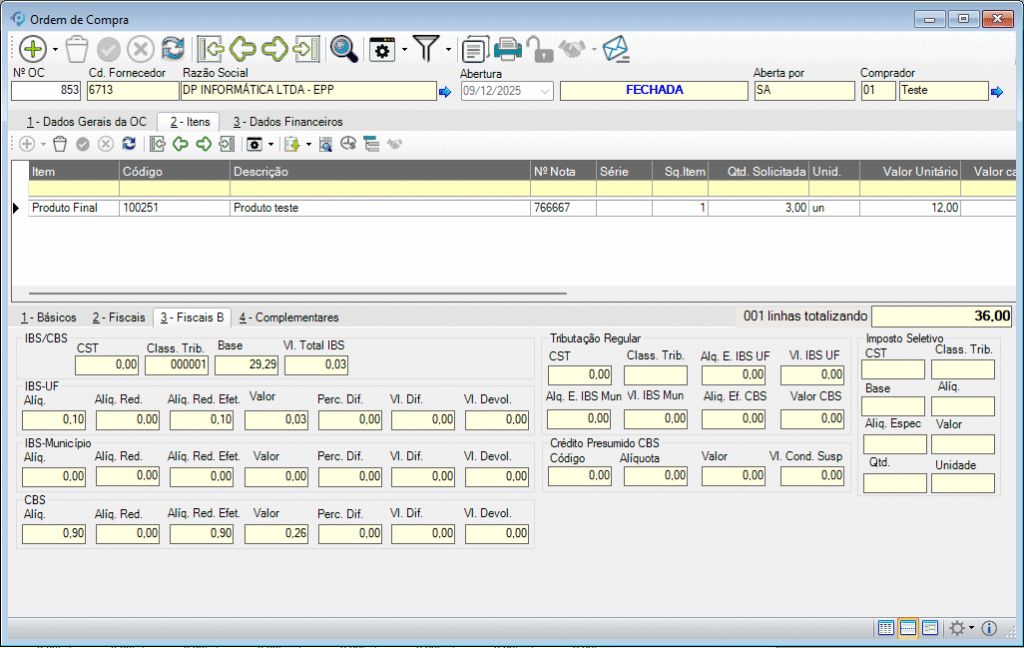 - Na Ordem de Compra (OC): Os campos de IBS/CBS estão localizados na Aba 3 – Fiscais B.