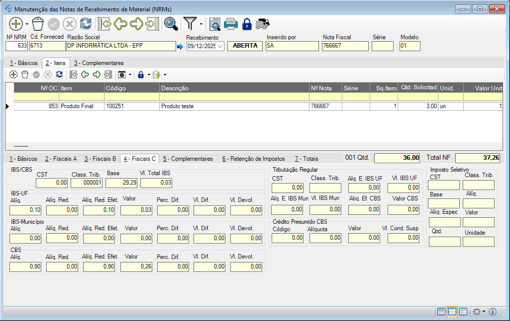 - Na Nota de Recebimento (NRM): Os campos de IBS/CBS estão localizados na Aba 4 – Fiscais C.
