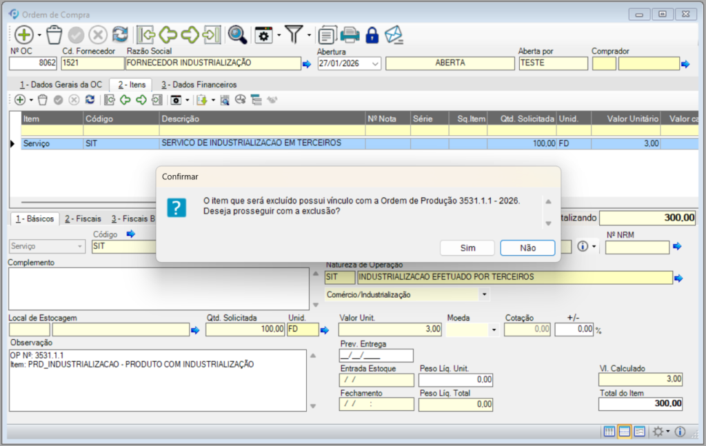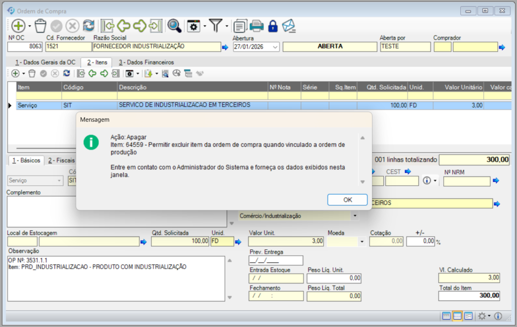 A partir do pack 2026.R2-S2, foram incluídas melhorias no processo de exclusão de itens em Ordens de Compra (OC) que possuam vínculo com Ordens de Produção (OP).