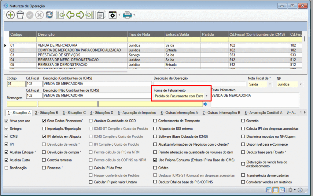 Atualmente, o vínculo da forma de faturamento já pode ser configurado diretamente na manutenção “Natureza de Operação”, o que torna a manutenção anterior redundante.