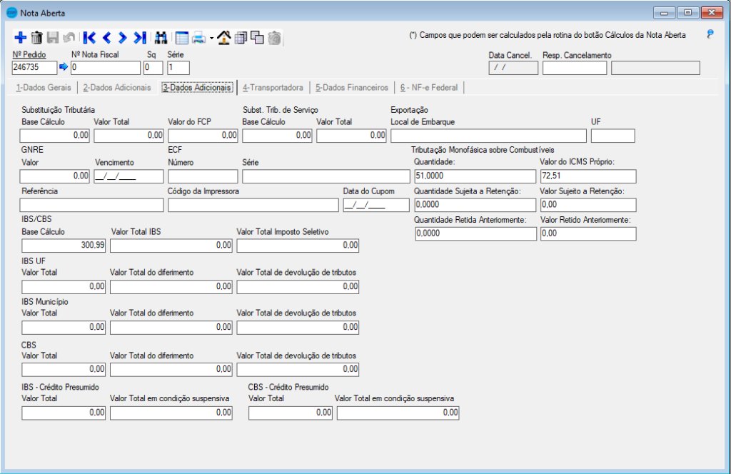 A partir da versão 2026.R2-S4, o sistema disponibiliza novos campos da tributação monofásica de combustíveis, tanto no cabeçalho quanto nos itens da nota aberta do Vendas.