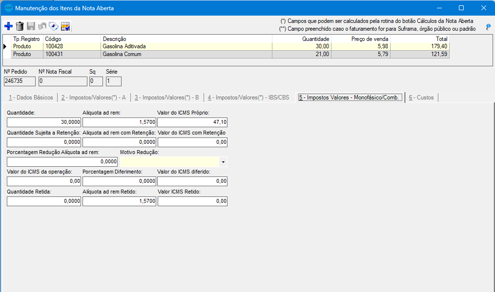 • Localização: Itens da Nota → Aba 5 – Impostos Valores – Monofásico/Comb.