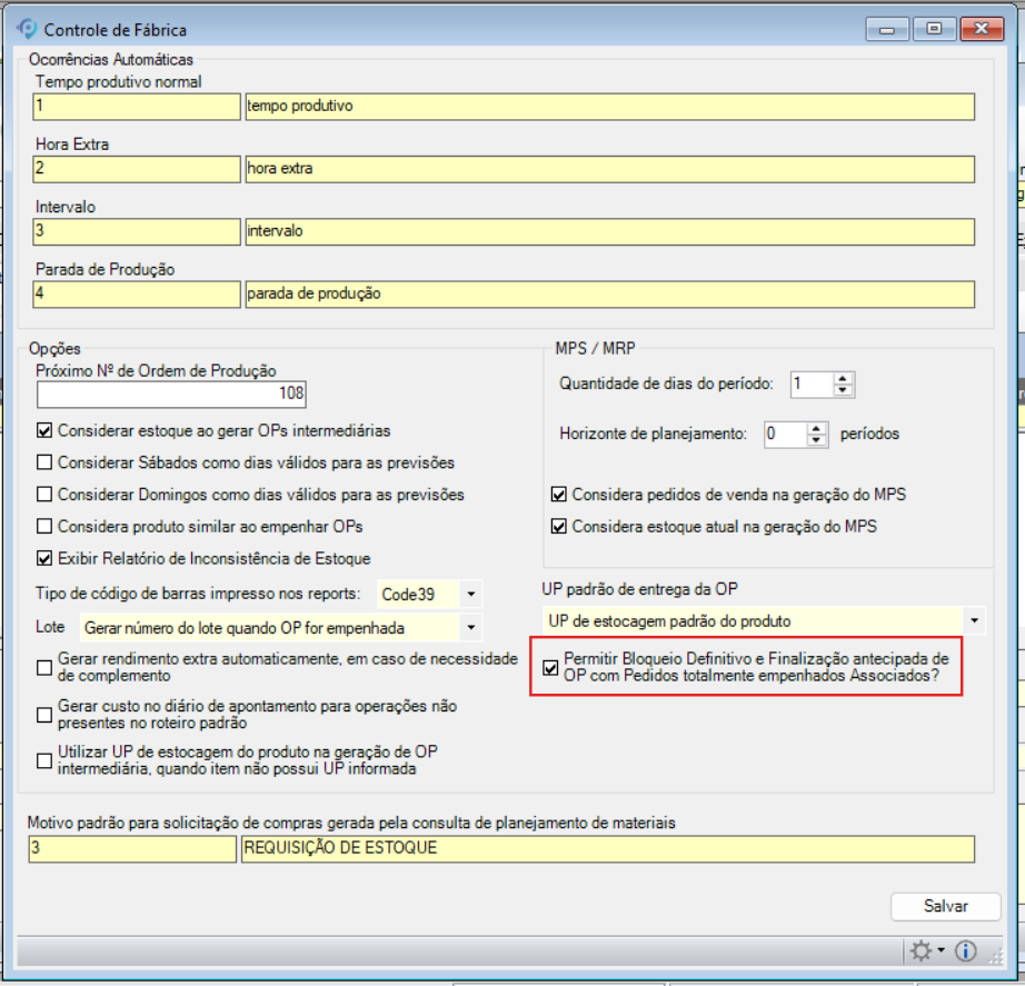 Para que este comportamento seja habilitado, é preciso ativar a configuração: “Permitir Bloqueio Definitivo e Finalização antecipada de OP com Pedidos totalmente empenhados Associados?”