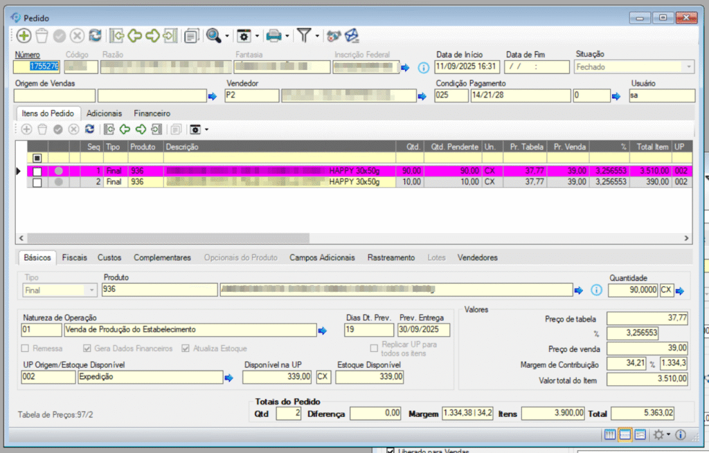 - A quantidade não produzida é desmembrada em um novo item no pedido.