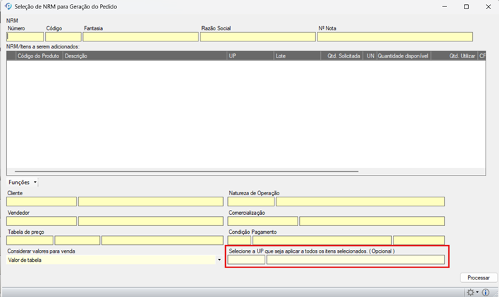 - Campo opcional: Se preenchido, todos os itens do faturamento usarão a UP informada.