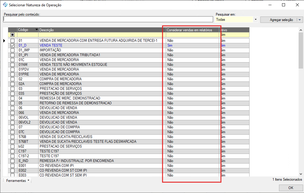 Ao usar o filtro “Selecionar Natureza de Operação”, o usuário poderá visualizar através da nova coluna “Considerar Vendas em relatórios” se a natureza está marcada ou não. Isso permite análises mais consistentes e refinadas, refletindo exatamente quais naturezas devem ser consideradas para análise das operações de venda.
