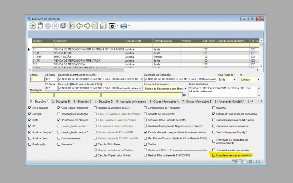 Administração → Setup da Aplicação → Vendas e Faturamento → Natureza de Operação → Aba 1 – Situações A → Considera vendas em relatórios