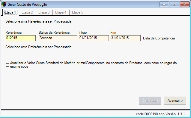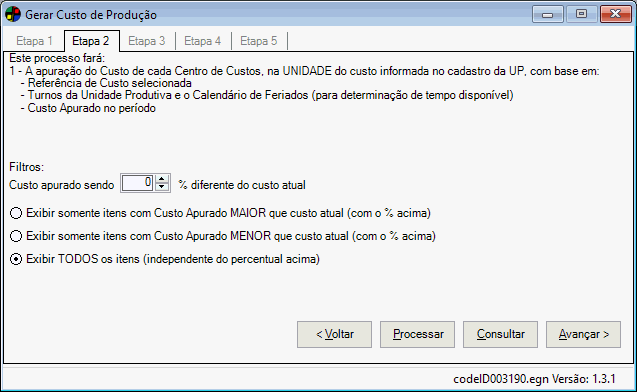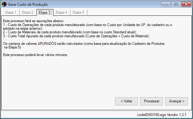 Para o correto funcionamento da ferramenta de geração do custo de produção é utilizado o codeID003190.egn, de forma que, caso haja necessidade de personalização de processos no momento de gerar os custos, essa possa ser feita no mesmo..