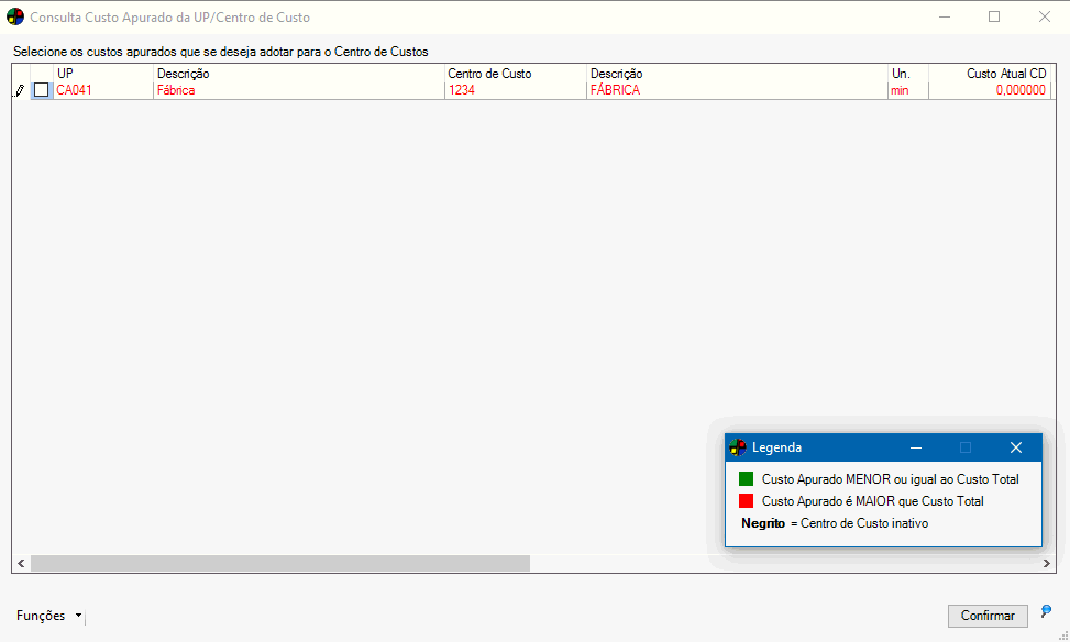 Nesta aba é feita a apuração do custo de cada centro de custo, na unidade do custo informada no cadastro da UP. Será calculado o valor do custo minuto da tarifa do Custo Direto e do Custo Indireto de Fabricação, e os mesmo serão salvos na tabela Custo Apurado.