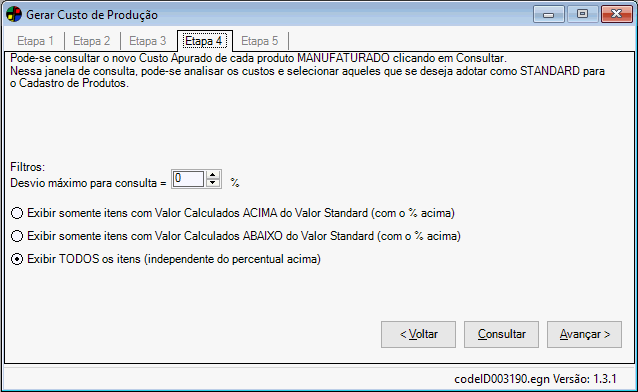 Neste campo informe o percentual de desvio a ser aplicado como filtro ao custo de produção.