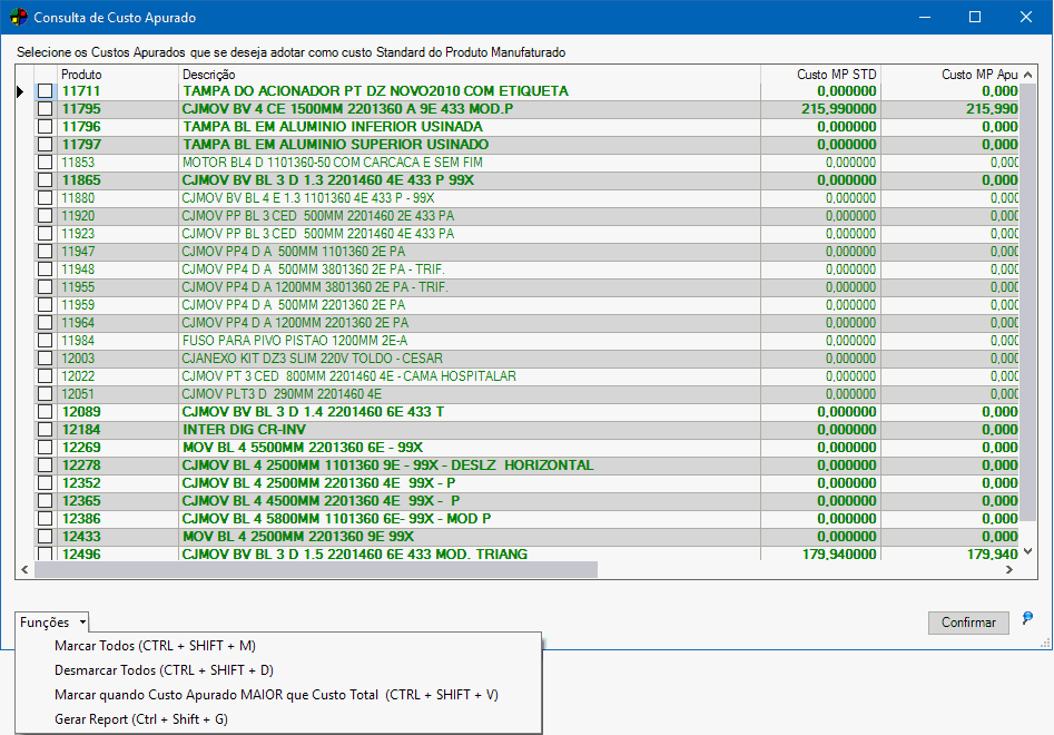 Para consultar os produtos que se enquadram nos filtros aplicados clique no botão Consultar. Como exibido abaixo, na janela de consulta de Custo Apurado. Após feitas as seleções desejadas clique no botão OK e voltar para Etapa 4.