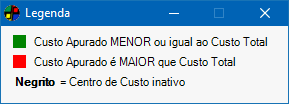 uma das opções para ser considerada a partir do percentual informado: Exibir somente itens com Custo Apurado MAIOR que custo atual (com o % acima), Exibir somente itens com Custo Apurado MENOR que custo atual (com o % acima) ou Exibir TODOS os itens (independente do percentual acima).