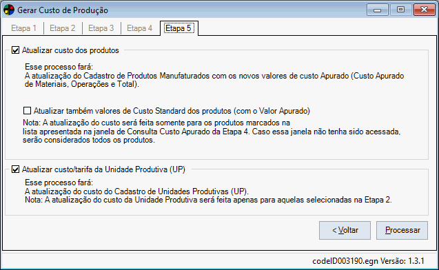 Esse processo fará: A atualização do custo do cadastro de Unidades Produtivas (UP). Essa atualização será feita apenas para aquelas selecionadas na Etapa 2.