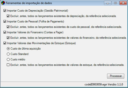 Nesta ferramenta pode-se realizar a importação de custos de depreciação, de pessoal e do financeiro para a referência selecionada.