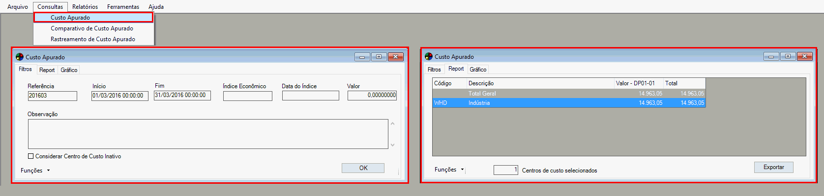 Após realizar a apuração dos custos, é possível verificar como ficou o custo de cada centro de custo através da consulta de custo apurado.