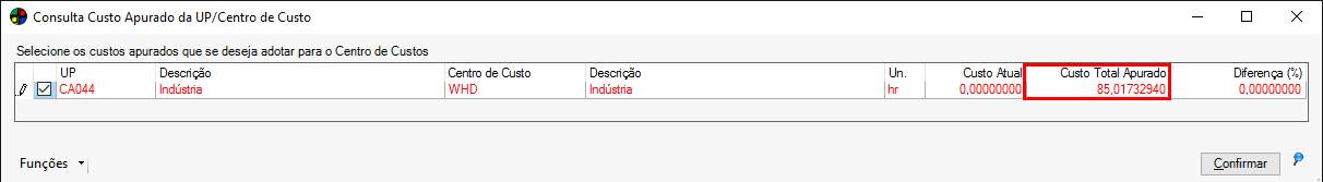 Ao realizar o processamento da etapa 2 e depois consultar, é possível verificar o valor de custo da UP no botão consultar, custo esse que deverá ficar da seguinte maneira: