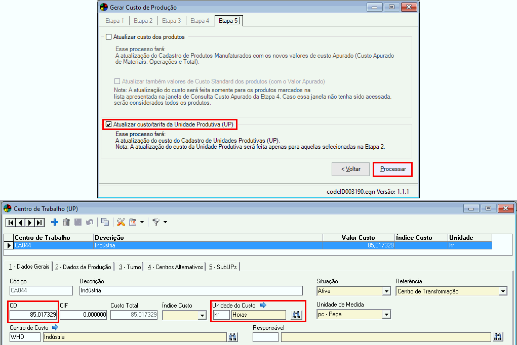 Na etapa 5 deve-se desmarcar a opção para Atualizar o custo dos produtos, e marcar a opção para Atualizar custo/tarifa da UP. Após finalizar o processamento do botão processar, já será possível verificar no cadastro do centro de trabalho o valor que foi atribuído.