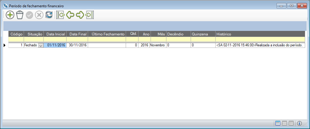 Veja abaixo situações do funcionamento do período de fechamento em algumas operações do Dataplace como, pedido faturamento, pagamentos, recebimentos, NF-e e NRM. As operações serão realizadas no período do mês de novembro de 2016, que está fechado no Dataplace pelo usuário, conforme a imagem abaixo: