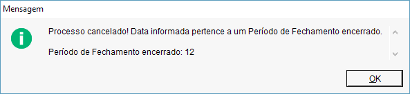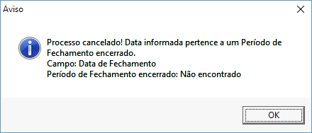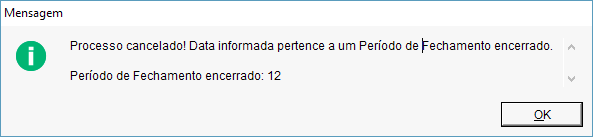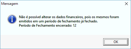 Se houver uma alteração de uma parcela nos dados financeiro (como exclusão por exemplo) em um registro no dia 18/11/2016, sabendo que o período de fechamento do mês de novembro de 2016 está encerrado, será exibida a mensagem abaixo. Pois quando um período de fechamento está encerrado não será possível realizar nenhuma operação que gere movimentação no financeiro.