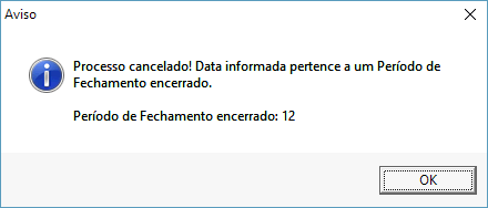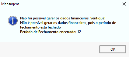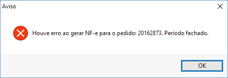 Quando o usuário tenta gerar uma NF-e com emissão no dia 20/11/2016, sendo que período do mês de novembro de 2016 está fechado, a mensagem abaixo será exibida, não permitindo gerar o documento. Pois quando um período de fechamento está encerrado, o sistema não permite gerar nenhuma operação que realize movimentações no financeiro.