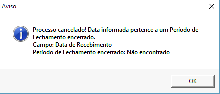 Houve um encerramento de uma NRM com a data de recebimento dia 25/11/2016, o sistema não irá permitir este encerramento pois o mês de novembro de 2016 está encerrado e será exibido a mensagem abaixo. Pois quando um período de fechamento está encerrado não será possível realizar nenhuma operação que gere movimentação no financeiro.