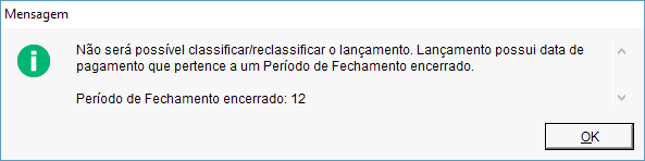Ao classificar valores de um lançamento quitado no dia 15/11/2016 e o período de fechamento de novembro de 2016 estiver encerrado, a mensagem abaixo será informada. Porque o Dataplace não irá realizar operações que altere o financeiro de um período de fechamento encerrado.