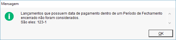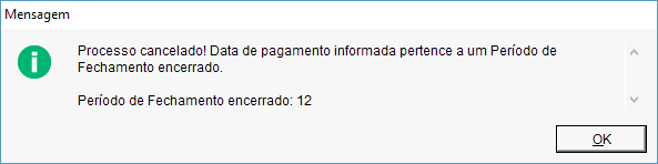 Um pagamento do dia 15/11/2016, será quitado com um cheque, este pedido está dentro do período de fechamento de novembro de 2016 que já está encerrado. Neste caso será exibido a mensagem abaixo, e não será prosseguido a operação. Pois o Dataplace não realizará operações que altere o financeiro de um período de fechamento encerrado.