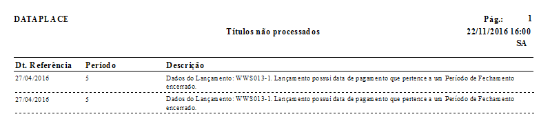 Caso tente reabilitar parcelas do dia 27/04/2016 para exportação contábil, sendo que o período de abril de 2016 está encerrado, será gerado um relatório dos títulos não processados informando que o período dos lançamentos selecionado está encerrado. Pois o Dataplace não realizará operações que altere o financeiro de um período de fechamento encerrado.