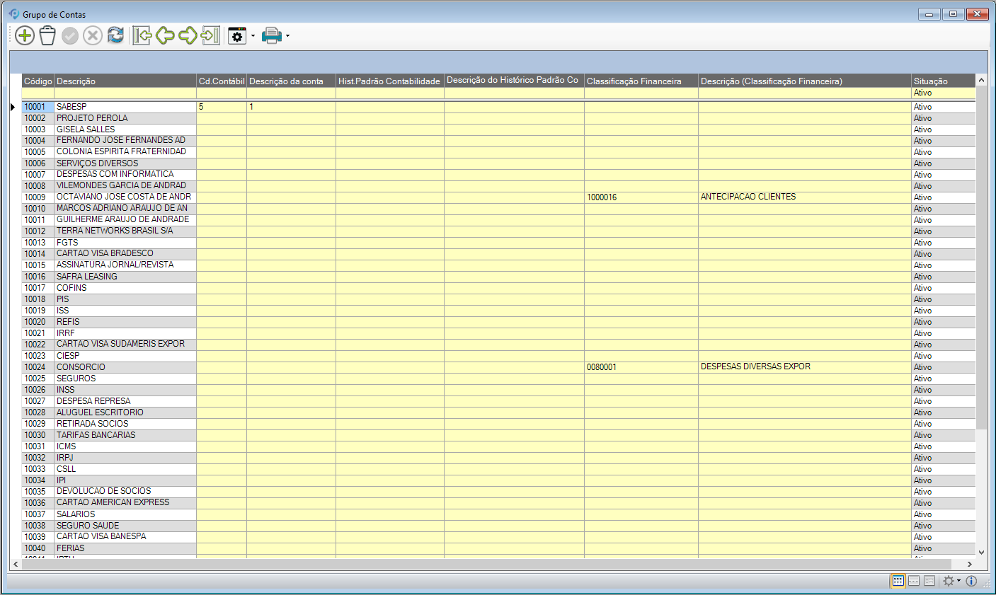Índice Econômico Diário/Taxa de Conversão de Câmbio, Grupo de Contas, Centro de Custo, Lançamento Padrão Financeiro, Bancos, Plano de Despesas e Receitas, Documentação de Quitação, Administradora do Cartão, Feriados, Classe e Subclasse, entre outros.