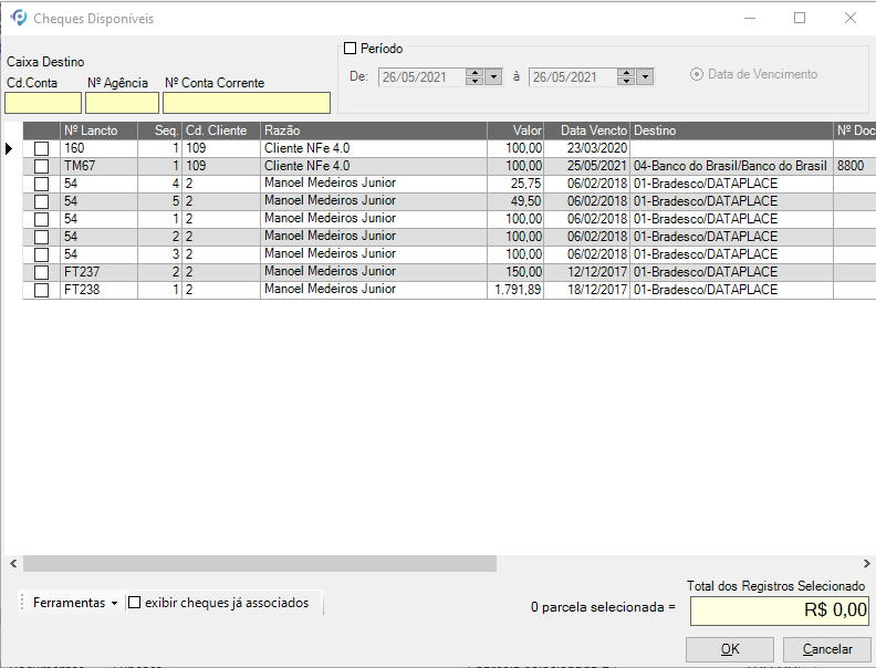 na data (com notificação na janela de Caixas e Bancos) em que o registro