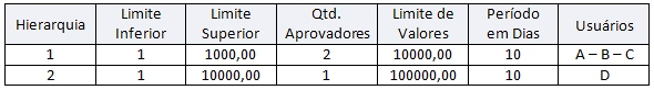 1. O usuário deverá definir ao menos uma hierarquia com tipo de aprovação por Limites;