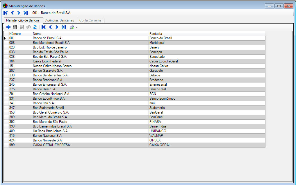 Nessa aba serão cadastradas as agências bancárias correspondentes ao banco selecionado na aba anterior. Para selecionar um banco clique sobre ele ou navegue pelas setas de direção. O nome do banco selecionado irá aparecer na parte superior da janela de Manutenção de Bancos.