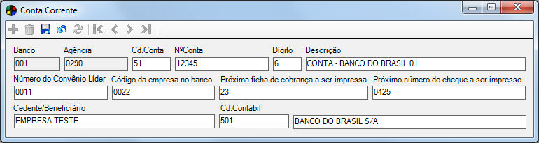 Nessa aba serão cadastradas as Contas Correntes pertencentes a empresa possui em determinado banco.