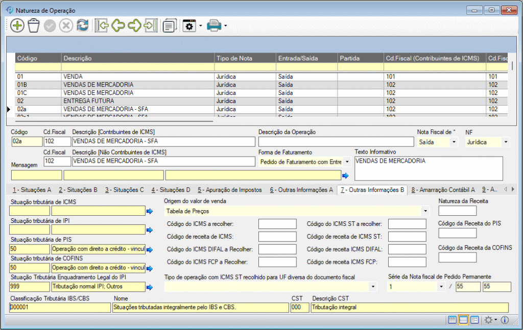 Foi adicionado o campo Classificação Tributária IBS/CBS na tela de cadastro e manutenção da Natureza de Operação. O novo campo pode ser encontrado na Aba 7 – Outras Informações B.