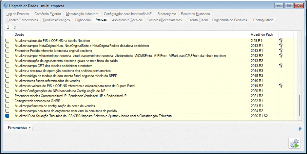 Importante: Após a atualização do banco de dados para a versão 2026.R1-S2, é necessário que o técnico execute o processo de Retrofit. Este procedimento é essencial para empresas que já possuem registros nas tabelas de Situação Tributária IBS/CBS/IS e Classificação Tributária IBS/CBS.