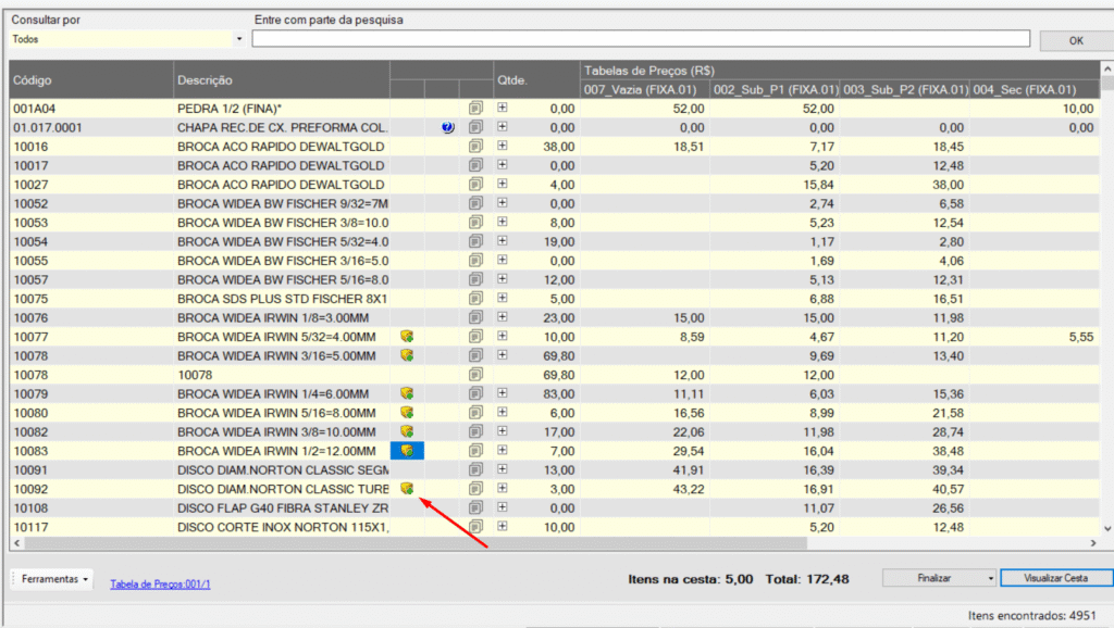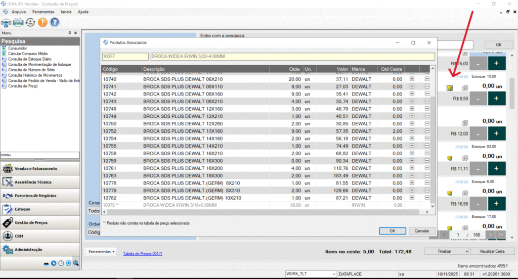Caso algum produto associado não esteja presente na tabela de preços selecionada (visível no rodapé), ele será exibido em cinza claro ao final da lista, indicando indisponibilidade para inclusão.