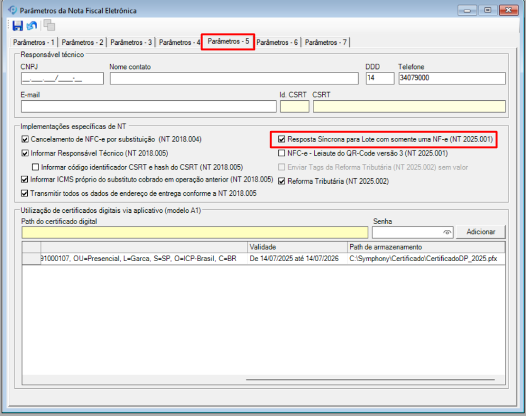 Para utilizar esse recurso, é necessário habilitar a opção “Resposta Síncrona para Lote com somente uma NF-e (NT 2025.001)”, localizada no Painel NFe → Menu Configuração → Parâmetros: