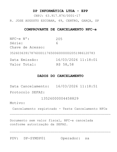 Essa funcionalidade permite gerar um comprovante para registro da operação de cancelamento da NFC-e, facilitando a conferência e o controle das transações realizadas.