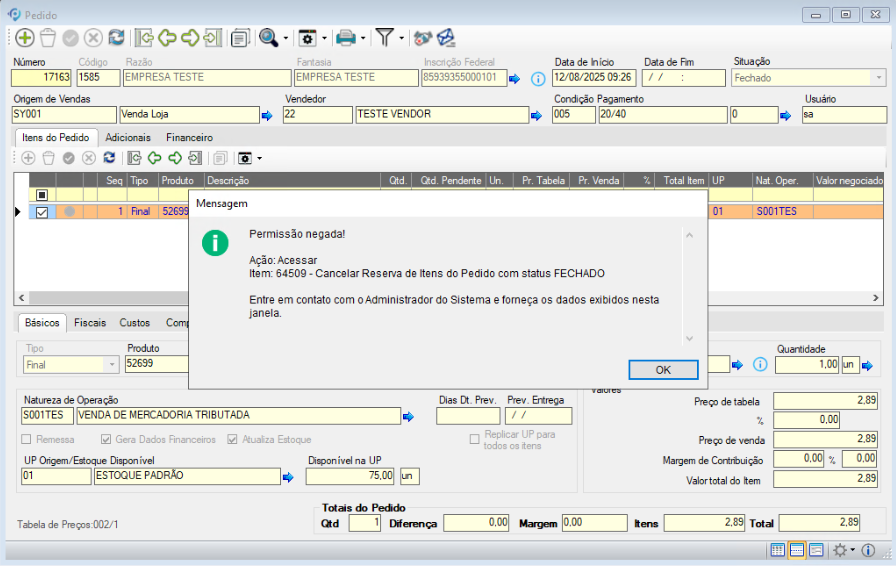 A partir do pack 2026.R1-S1, foi criado o item de segurança IS 64509, responsável por controlar a retirada do empenho de produtos em pedidos com status Fechado.