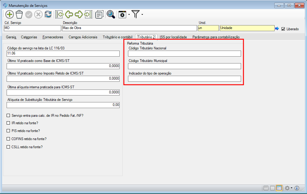 Três novos campos foram adicionados na aba Tributário 2 do Cadastro de Serviço: