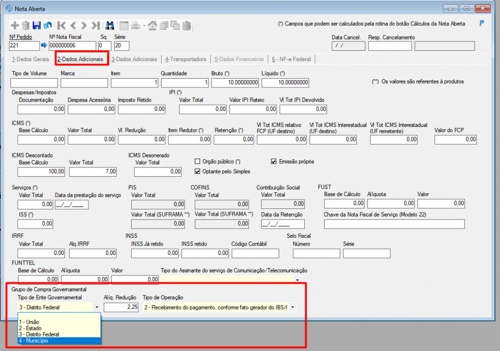 Em Gestão de Vendas >> Faturamento >> Nota Aberta >> Aba 2- Dados Adicionais: