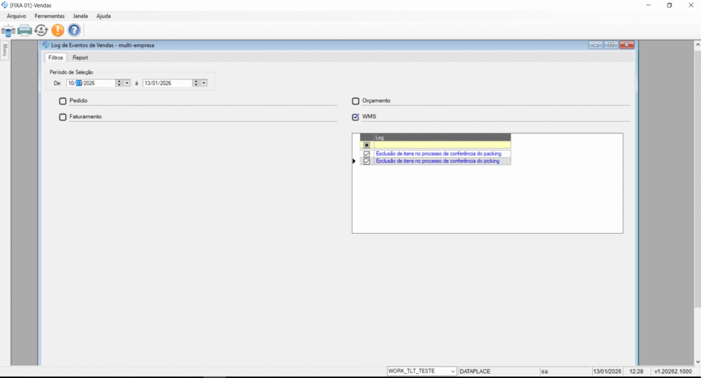 Além disso, sempre que um item for removido da conferência, um log será automaticamente gerado e poderá ser consultado no Relatório de Log de Vendas, que agora conta com uma nova opção específica para WMS.