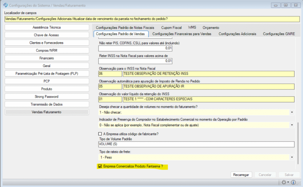 O parâmetro que define se a empresa trabalha com produtos fantasma, anteriormente disponível apenas no arquivo de configuração config.ini, agora pode ser gerenciado diretamente pelo sistema.
