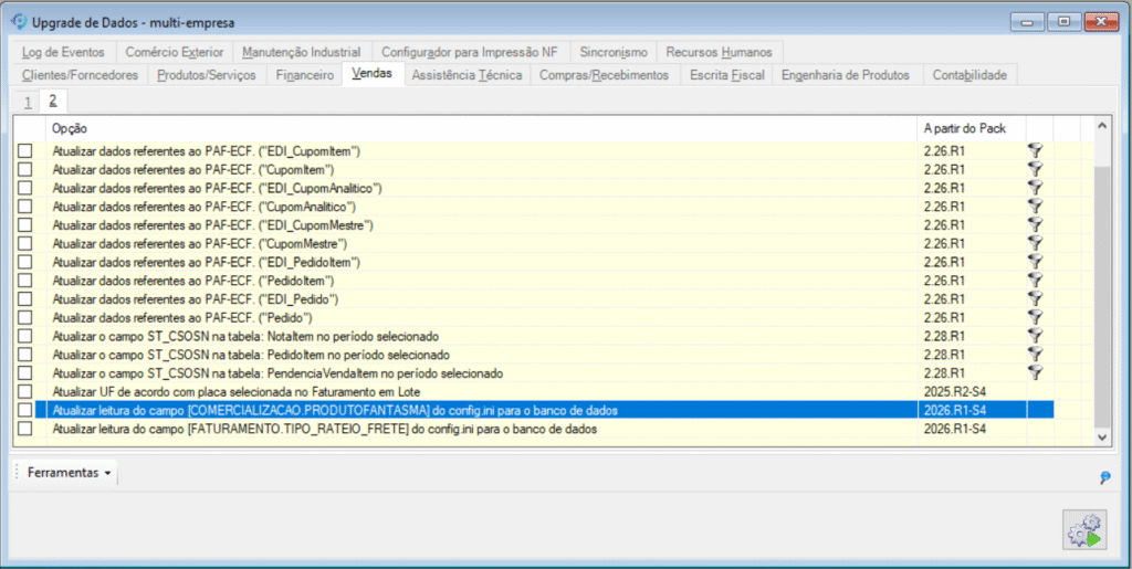 Para que a nova configuração seja lida, foi criada flag em Retrofit → Arquivo → Upgrade de Dados → Vendas → Aba 2 → “Atualizar leitura do campo [COMERCIALIZACAO.PRODUTOFANTASMA] do config.ini para o banco de dados“.