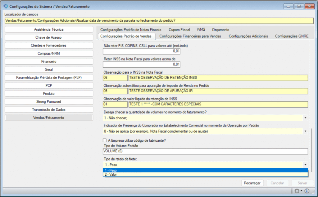 O parâmetro que define o tipo de rateio do frete, anteriormente disponível apenas no arquivo config.ini, agora pode ser gerenciado diretamente pelo sistema.