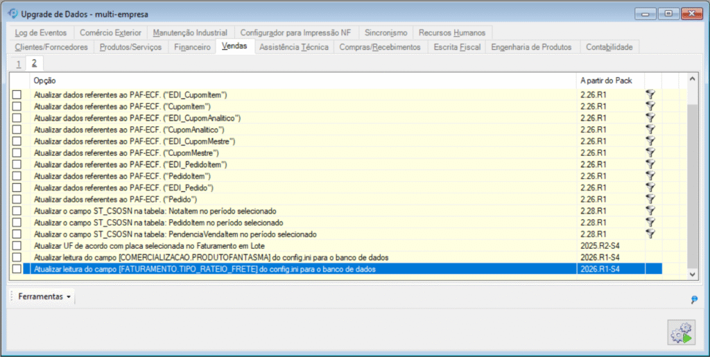 Para que a nova configuração seja lida, foi criada nova flag em Retrofit → Arquivo → Upgrade de Dados → Vendas → Aba 2 → “Atualizar leitura do campo [FATURAMENTO.TIPO_RATEIO_FRETE] do config.ini para o banco de dados”.